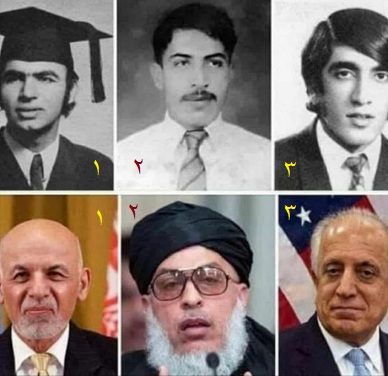 در عکس بالا، ظاهراً 6 نفر را میبینید؛ ولی در واقع، اینها 3 نفر هستند! از سمت چپ: نفر اوّل: رئیس جمهور افغانستان نفر دوّم: نمایندۀ گروهک طالبان در مذاکره صلح با دولت آمریکا نفر سوّم: سفیر آمریکا در کشور افغانستان و هر سه نفر، حدود سی-چهل سال قبل، دانشجویان افغانستانی بودند ، که در دانشگاههای آمریکا، بورسیه شدند و آنجا زندگی کرده و پرورش یافتهاند!! خندهدار نیست واقعا؟؟!! هر سه نفر آنها دستپروردۀ آمریکا هستند؛ و برای افغانستان مظلوم، دارن فیلم بازی میکنن! فیلمی به کارگردانی آمریکا!!