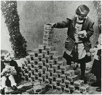 به این عکس دقّت کنید! کشور آلمان پس از جنگ جهانی اوّل، دچار یک اَبَر تورّم بسیار شدید شد، که سقف 322 درصد را شکافت! نقدینگی آنها به حدّی بیارزش شد که این کودک آلمانی در حال بازی با پول است!