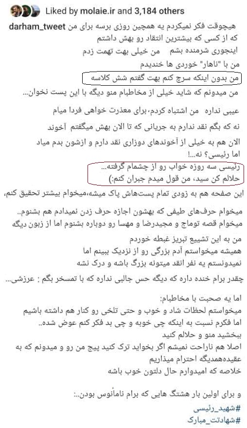 حلالیّت یکی از مخالفان رئیسی . . این پست را روز قبل از تشییع جنازۀ آیت الله رئیسی منتشر کرده: