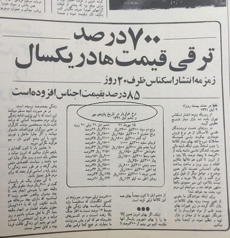 تورّم یا ترقّی قیمتهـا ...؟؟؟ . در زمان شاه، نه تحریم بودیم، نه جنگ اقتصادی علیه ما بود. امّا قیمتها افسار گسیخته بالا میرفته : 700 درصد !! . اما سایتها و شبکهها شاهپرست، حافظه تاریخی مردم را منحرف میکنن! و به دروغ اعلام میکنن که آن زمان، ارزانی بوده اما واقعیت چیز دیگریست... باز هم اسناد و مدارکی براتون رو میکنیم... .