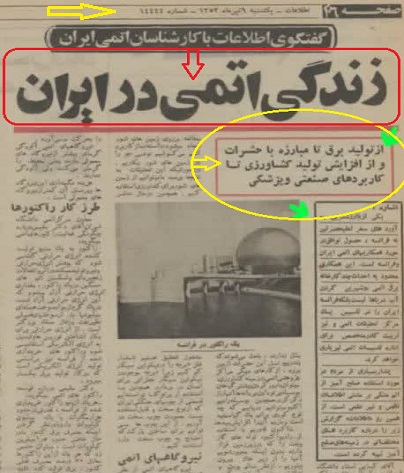 انرژی هستهای در زمان شاه یا زمان امروز؟ . (1) نمونهای از تبلیغات رسانهای از برنامه هستهای ایران در دهه 50 خورشیدی این روزنامه به بیان نقش زنان در برنامه هستهای ایران پرداخته است.