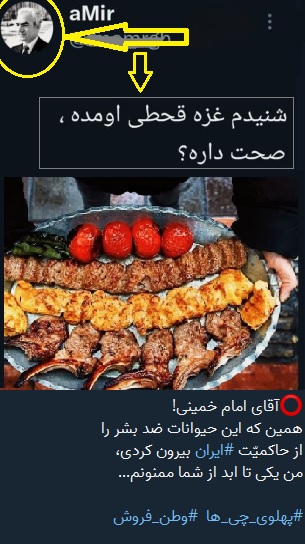 👆جملۀ زیرِ عکس بالا را بخونید 👆 این شخص، قبلا ضدّ جمهوری اسلامی بوده ولی وقتی این توئیت طرفدار رضا پهلوی را میبیند، از امام خمینی تشکّر میکند... 👆 . . (5) این دو توئیت، متعلّق به یک نفر است. یکی از طرفداران متعصّب شاه پهلَوی