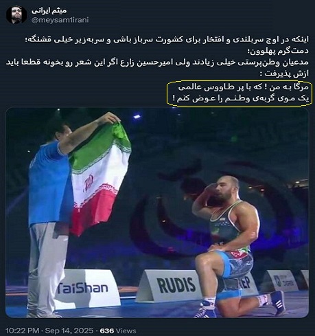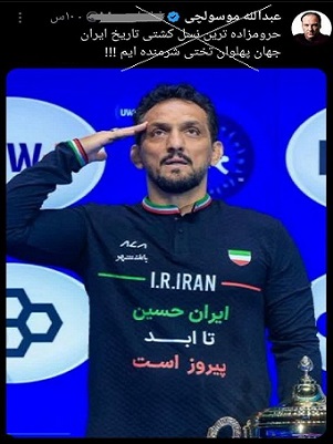 و این هم توئیتِ صفحۀ یک وطنفروش و توهین به کشورش! این شخص (موسولچی) یک بهاییِ ضدّ اسلام است و طرفدار سلطنت ممدرضا شاه پهلوی و به دنبال تجزیۀ ایران . + کاش لااقل میدانست که جهانپهلوان تختی هم ضدِّ شاه پهلوی بود! 🤪 . . (2) سلام و احترام نظامی به پرچم ایران توسّط پهلوان "امیرحسین زارع"