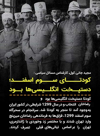 آیا از کودتای 3 اسفند خبر دارید؟ . 1- کودتا: یعنی شورش ضدّ حکومت با زور اسلحه، بدون حضور مردم، و با کمک یک دولت خارجیِ دشمن! 2- امروز 3 اسفند است؛ سالروز کودتای سوّم اسفند 1299 رضاخان، به کمک انگلیس! همین! . . . 👇👇👇 لینک بازدید از صفحۀ اصلی وبلاگ . . برچسبها: خاندان شاه پهلوی [ جمعه سوم اسفند ۱۴۰۳ ] [ 6:32 ] [ انجمن جلال آل احمد ]